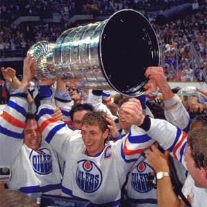 With his teammates surrounding him, Wayne Gretzky celebrates the third Stanley Cup victory of his illustrious career.