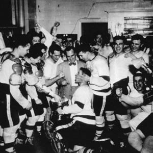 Icing the bowl. Netminder Terry Sawchuk, who backstopped the Red Wings to three titles in the early 1950s, is toasted by his Detroit teammates. Photo courtesy: Walter P. Reuther Library, Wayne State University.