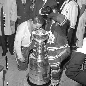 Champagne is the elixir of champions, and no Stanley Cup celebration is complete without it. Marcel Pronovost and David Keon, both later to be inducted into the Hockey Hall of Fame, share the bubbly as members of the 1967 Toronto Maple Leafs.