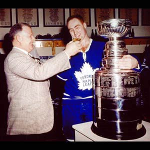 Toronto owner Harold Ballard lifts a glass of champagne for his veteran centre Red Kelly, who refuses to let go of the Stanley Cup.