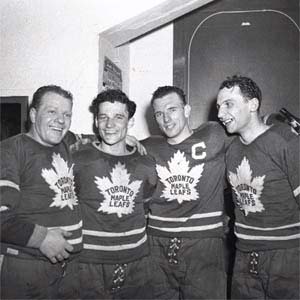 This quartet of Maple Leafs formed the foundation of three consecutive Stanley Cup titles in the late 1940s. Standing left to right are goaltender Turk Broda, tough winger Bill Ezinicki, captain Ted Kennedy and hardrock defenseman Gus Mortson.