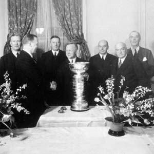 In their fourteen years of existence, the Montreal Maroons won the Stanley Cup on two occasions - 1926 and 1935. Here, the owners pose with hockey's greatest prize. The Maroons folded after the 1937-38 season.