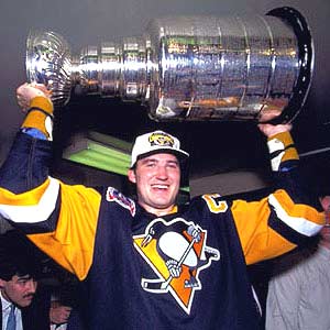 Mario Lemieux hoisting his first Stanley Cup