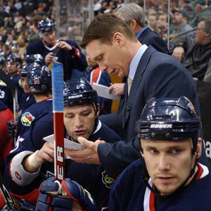 Columbus Blue Jackets Assistant Coach Newell Brown draws up a play for Jody Shelley. (Tom Dahlin/Hockey Hall of Fame)