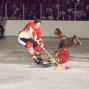 Team Canada's Pete Mahovlich tries to score