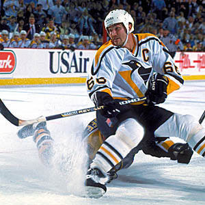 Mario Lemieux of the Pittsburgh Penguins gets taken down.