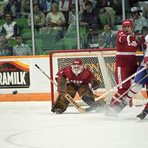 Vladimir Myshkin of the Soviet Union tracks the puck during Canada Cup game action against Canada. (James Lipa/Hockey Hall of Fame)