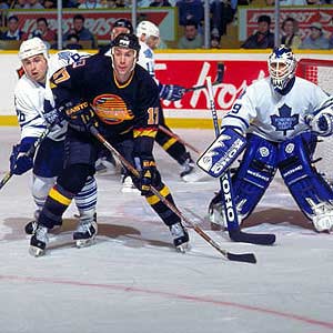 Mike Ridley of the Vancouver Canucks fights for