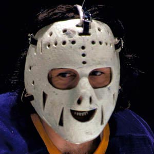 A pleased Los Angeles Kings netminder Rogie Vachon, teeth aglow, showcases his protective gear during the early 1970s.