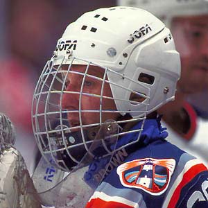 Islanders' netminder Tommy Soderstrom fashioned the over-sized cage/helmet style. (circa 1994-97)