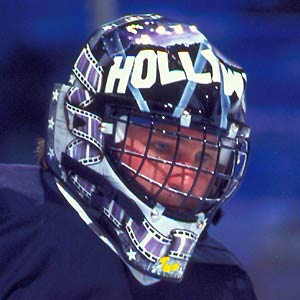 Images of film reels littered the mask of Kelly Hrudey while he played