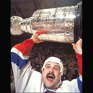 Famer Bryan Trottier hoisting the Stanley Cup