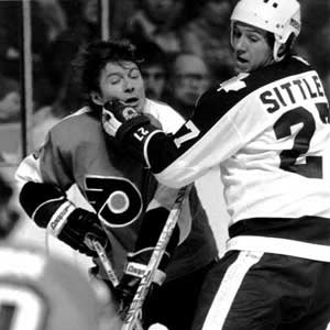 Darryl Sittler holds up future teammate Bobby Clarke