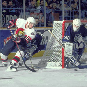 Ottawa's Alexander Daigle with a scoring chance against the Hartford Whalers netminder. (Ottawa Senators/HHOF)