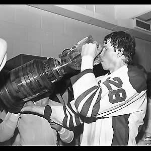 Oshawa defenseman Gord Murphy takes a drink from the J. Ross Robertson Cup - (Oshawa Times)