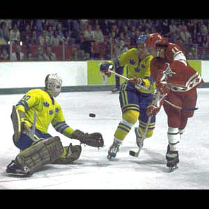 Soviet Union forward Boris Alexandrov gets a shot off against Sweden's Hardy Astrom during the inaugural Canada Cup in 1976.