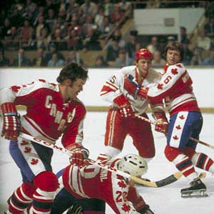 The 1974 WHA-USSR tournament was a hard fought series that produced three ties in eight games. Pictured is Rick Ley of the WHA who skates to the puck while teammate Brad Selwood holds back top Soviet scorer Alexander Yakushev.