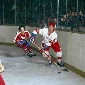 The Soviets skated away to victory winning four and tying three in the eight-game series. Pictured is Soviet Valeri Vasiliev and Mike Walton of the WHA.