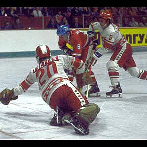 Czechoslovakia's Milan Novy, who tied for the tourney lead with 5 goals, tries to elude Juri Ljapkin of the Soviet Union, while Vladislav Tretiak attempts to make a save during the 1976 Canada Cup.