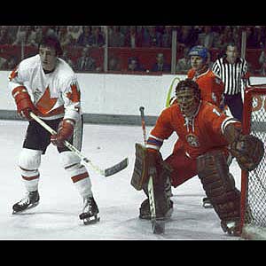 Canada's Phil Esposito positions himself in front of Czechoslovakia netminder Vladimir Dzurilla during Canada Cup action in 1976.