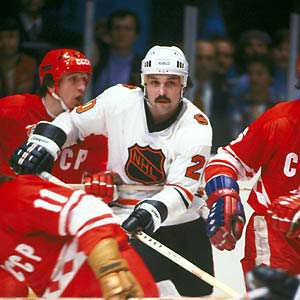 The Soviets proved too much for the NHL stars as they won both games two and three to win the series. Pictured is Bryan Trottier encircled by Soviet players.