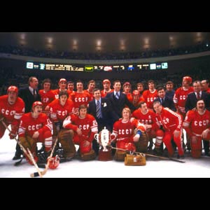 The Soviet Union take the traditional on-ice team photo following their Challenge Cup victory.