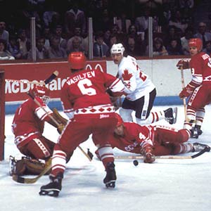 Soviet Union defensemen Sergei Babinov and Vlaery Vasiliev look for a loose puck in front of netminder Vladimir Myshkin, while Canada's Paul Reinhart moves in for a rebound during Canada Cup action in 1981.
