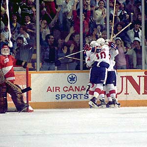 A dejected Sergei Mylnikov contemplates what could have been while Canada's Mario Lemieux is mobbed by his teammates. Sequence 4 of 4.