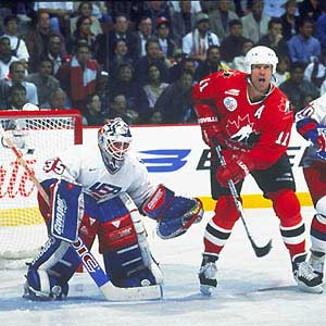 Canada's Mark Messier is ready for a possible rebound during the inaugural World Cup in 1996.