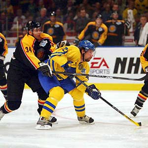 Germany's Eduard Lewandowski tries to tie up Sweden's Peter Forsberg. The Swedes won the round-robin game 5-3.