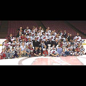 (July, 2003) A celebratory team/family photo shoot welcoming four new members to the clan - (from left to right) the Vezina Trophy, William M. Jennings Trophy, Stanley Cup, and Prince of Wales Trophy.