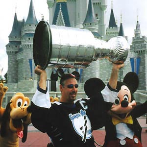 (June, 2004) Tampa Bay Lightning captain Dave Andreychuk sports a different sort of protective headgear as he waves to the crowd at Walt Disney World with pals, Pluto and Mickey Mouse. (Walt Neubrand)