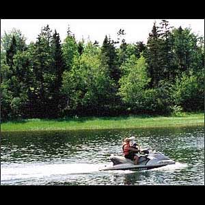 (August, 2004) Wearing a life jacket, the Stanley Cup takes a ride with the Lightning's Brad Richards around Cahoon's Cove on a Sea-Doo.