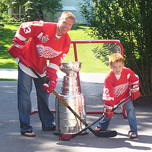 Kris Draper and his 6-year-old son Kienan hone their hockey skills as Stanley tends goal. (Bill Wellman/HHOF)