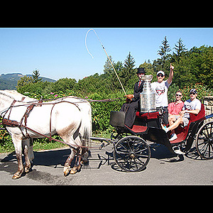 Jiri Hudler (left) joins teammates Dominik Hasek (centre) and Tomas Kopecky (right) on a horse-drawn carriage. (Mike Bolt/HHOF)