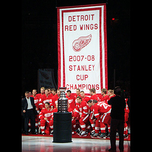 Members of the Red Wings 2008-09 roster crowd around the Cup as the franchise's most recent Stanley Cup banner is raised to the rafters of Joe Louis Arena. (Bill Wellman/HHOF)