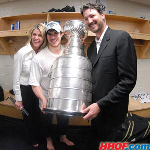 Nathalie Lemieux, Sidney Crosby and Mario Lemieux pose for a photo with the Stanley Cup. (Craig Campbell/HHOF)