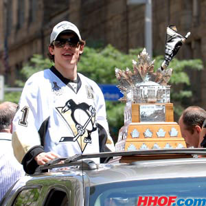 Evgeni Malkin with the Conn Smythe trophy at his side during the Stanley Cup Champion victory parade. (Craig Campbell/HHOF)