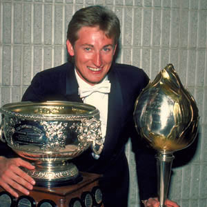 Wayne Gretzky of the Edmonton Oilers poses with the Hart and Art Ross trophies. (Robert Shaver/Hockey Hall of Fame)
