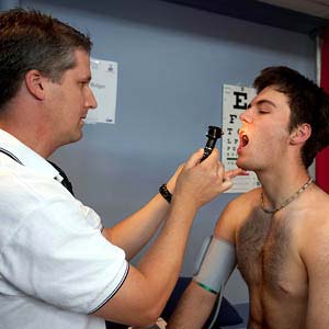 Team doctor Dr. Grant Bolger examines Medicine Hat free agent Spencer Hodgson during medicals on the first day of training camp.