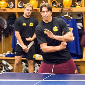 Kris Chucko limbers up his reflexes with a game of ping pong in the Golden Gophers dressing room. (Tom Dahlin/HHOF)