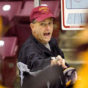 Head coach Don Lucia barks out instructions on day one of Golden Gopher's training camp. (Tom Dahlin/HHOF)