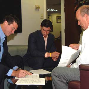 Pittsburgh Penguins Chairman, CEO and team captain Mario Lemieux is flanked by Sidney Crosby and General Manager Craig Patrick for the signing of Crosby's first NHL contract. (Matt Polk/HHOF)