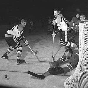 Johnny Bower makes a save against the Bruins