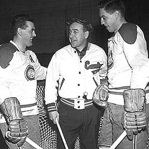Toe Blake (centre) talks with Rocket Richard