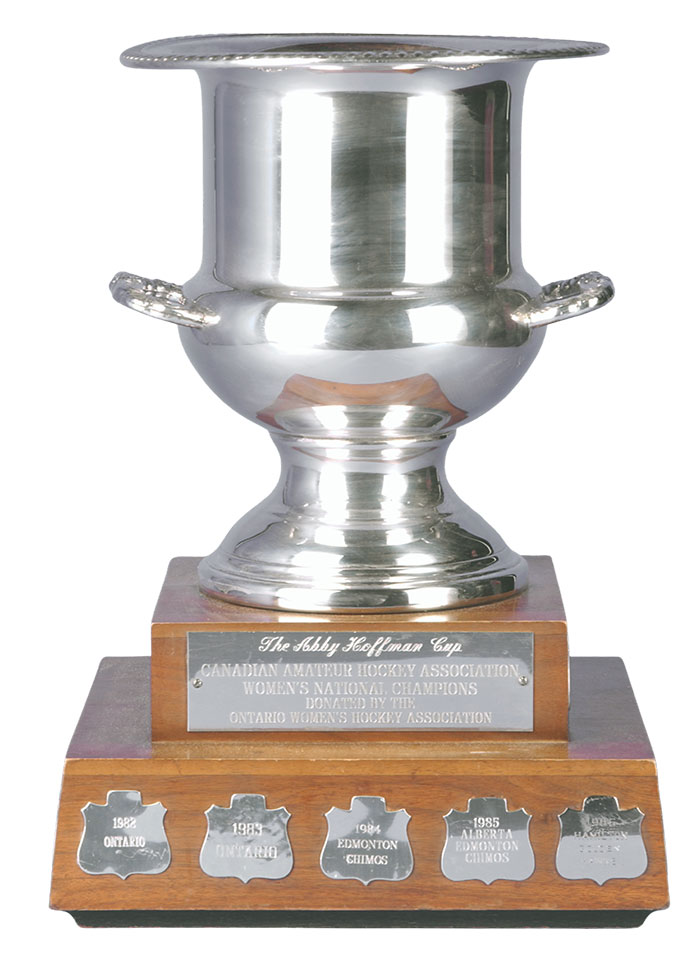 This Abby Hoffman Cup was introduced in 1982 at the first Canadian National Women's Hockey Championship held in Brantford, Ontario where the Ontario Women's Hockey Association unveiled this trophy to be presented to the gold medallists.