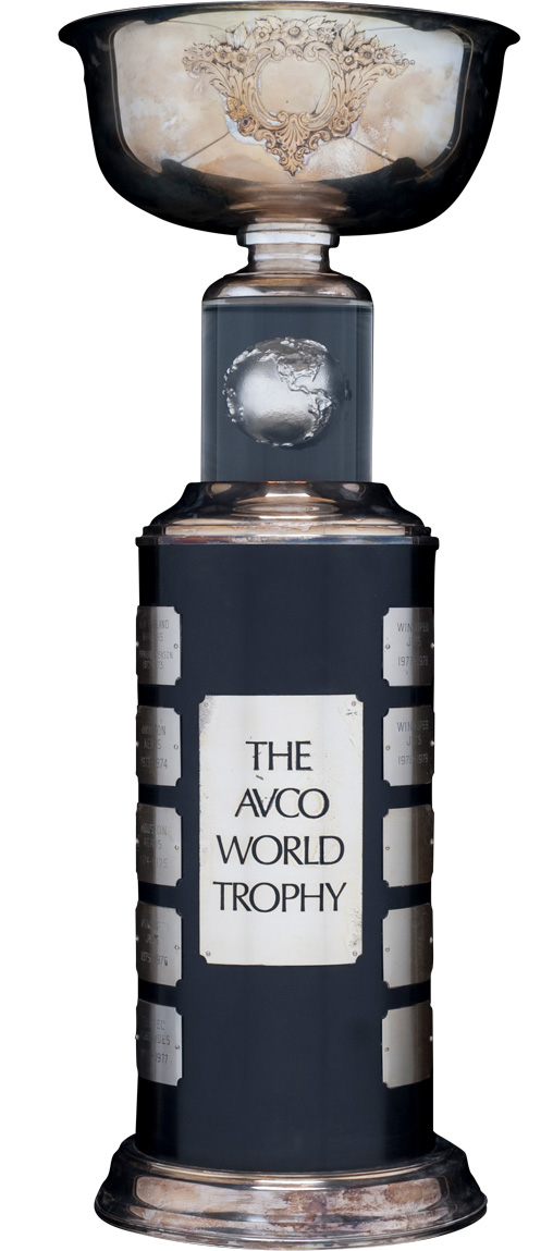 The AVCO World Trophy was given yearly to the championship team of the World Hockey Association (WHA). The trophy was donated to the new league in 1972 along with approximately $500,000 by the AVCO Financial Services Corporation. Thus the WHA became the only major sports league to have its championship trophy bear the name of a private corporation. There actually exist three AVCO trophies. Besides the one that is on display at the Hockey Hall of Fame, the others reside in Nova Scotia and Winnipeg. The Avco Trophy was retired after the WHA ceased operations in 1979. The Bobby Hull led Jets claimed the trophy on three ocassions while Gordie Howe and the Aeros won it twice.